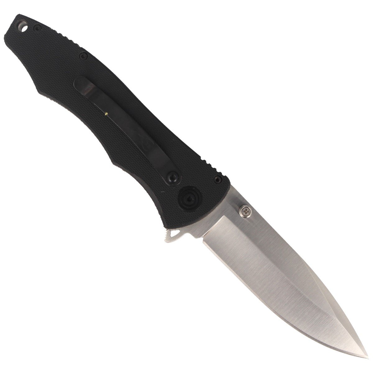 Głownia o profilu Drop Point, o grubości 3.6 mm, została utwardzona w zakresie 57-61 HRC, co czyni ją niezwykle wytrzymałą. Wykonana z wysokiej jakości molibdenowo-wanadowej stali nierdzewnej X60CrMoV15. Jej szlif wklęsły (Hollow grind) oraz gładkie ostrze typu Plain gwarantują znakomite właściwości tnące. Nierefleksyjna powłoka Satin Finish eliminuje odblaski. Dwa obustronne kołki, Thumb Stud i Flipper, umożliwiają błyskawiczne otwarcie noża. Dodatkową pewność zapewnia blokada typu Liner-Lock. Stalowy jelec u nasady głowni chroni dłoń przed przypadkowym zsunięciem się podczas pracy.