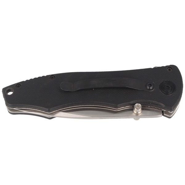 Rękojeść w kolorze black jest ergonomiczna i zoptymalizowana pod kątem komfortu. Pokryta teksturą okładzin wykonanych z wzmocnionego włóknem szklanym polimeru PTB, gwarantuje pewny chwyt nawet w wilgotnych warunkach. Karbowane nacięcia na grzbiecie rękojeści, znane jako Spine Jimping, zwiększają wygodę oraz pewność chwytu. Dodatkowo, nóż wyposażono w solidny metalowy klips, który można przykręcić śrubą typu torx. To pozwala na przenoszenie noża w pozycji tip-down (z czubkiem skierowanym w dół), co jest wygodne i komfortowe. W tylnej części rękojeści znajduje się otwór umożliwiający montaż linki zabezpieczającej.
