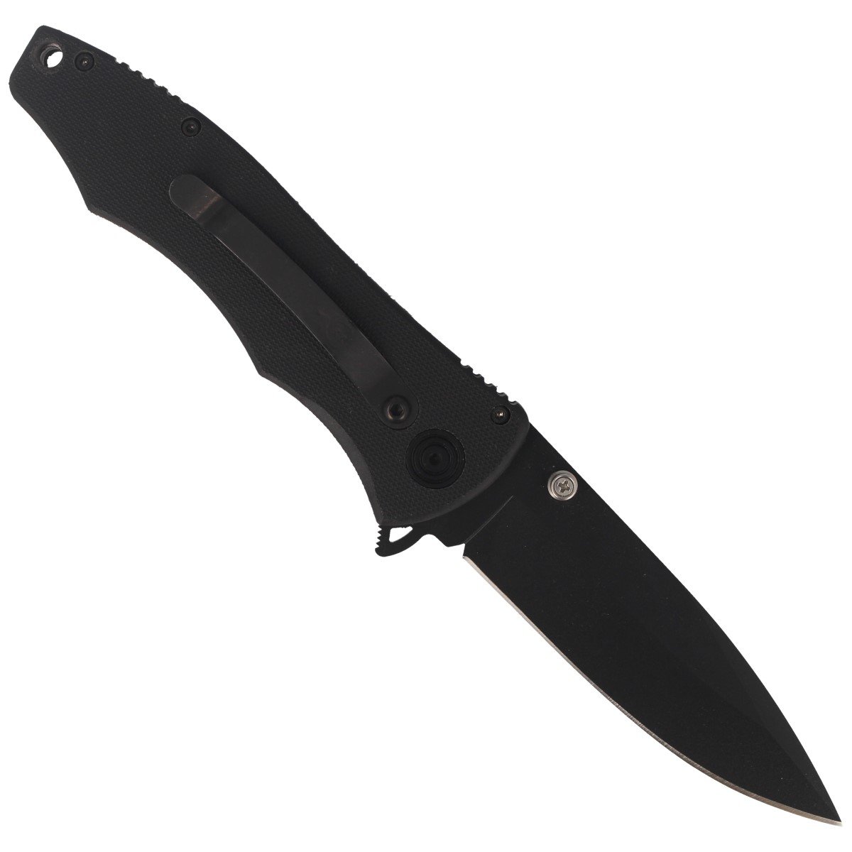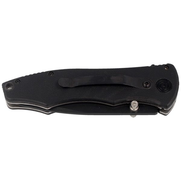 Rękojeść w kolorze black jest ergonomiczna i zaprojektowana z myślą o pewnym chwycie. Pokryta jest teksturowanymi okładzinami wykonanymi z polimeru PTB wzmocnionego włóknem szklanym, co zapewnia pewny chwyt nawet przy mokrych dłoniach. Karbowanie nacięcia na grzbiecie rękojeści Spine Jimping zwiększa wygodę i pewność chwytu. Nóż posiada solidny metalowy klips, który można przykręcić śrubą torx, umożliwiając przenoszenie noża w pozycji tip-down (czubkiem do dołu). W tylnej części rękojeści znajduje się otwór umożliwiający montaż linki zabezpieczającej.