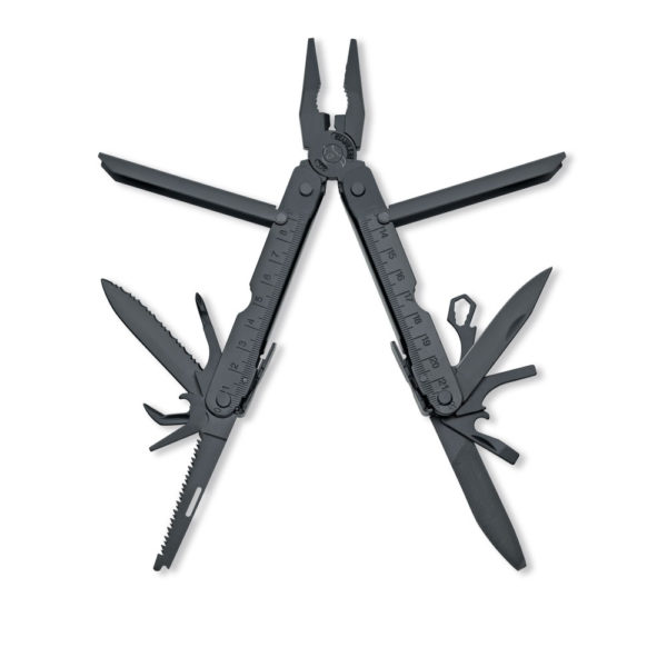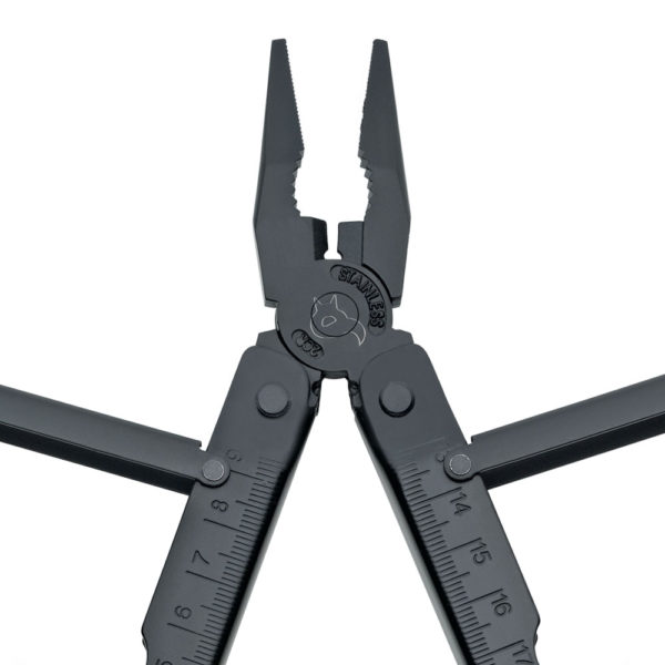 Multitool is made of 2CR stainless steel. It is a steel with good anti-corrosion properties and high hardness, hence it is often used in the production of cutting tools and surgical instruments. Coated with a black titanium coating has even better corrosion protection. In addition, in the case of the presented multitool, the coating gives it tactical features, i.e. it does not reflect light (anti-reflective properties) and blends better with the surroundings.