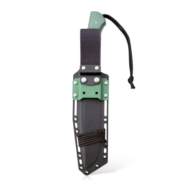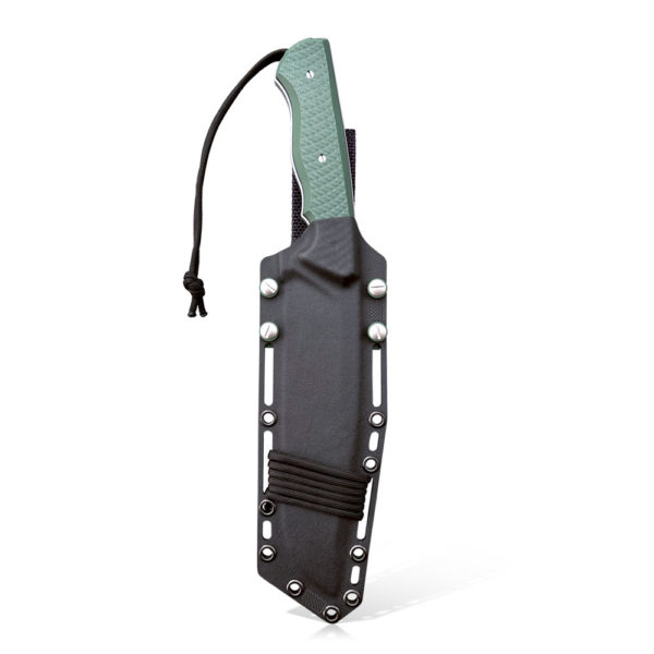 We attach the holster to the belt with a thick nylon grommet, strong, solid but flexible enough that it does not bother and does not compress when squatting or bending down. The set with the knife and the holster also includes an additional Kydex buckle. The buckle is put in place of the disassembled nylon grommet, which allows for mounting to MOLLE solutions (backpack, shoulder strap, harness with this solution). The optional protection of the knife can be obtained thanks to the through holes in the holster, by threading a string or a rope into them and additionally tying them. Of course, you can use the paracord supply that the holster is wrapped around (its color corresponds to the paracord section attached to the knife).