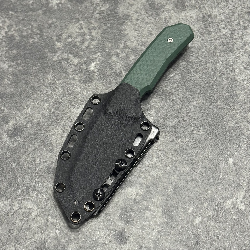 **The handle scales, fitted over the internal tang, are made from green G10. The set includes a black Kydex sheath equipped with an UltiClip Slim 3.3 and a prototype pictogram.