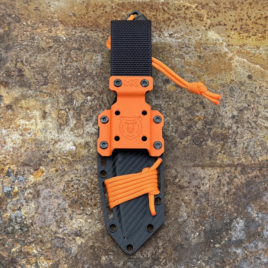 - The handle scales are crafted from exclusive Lithuanian FatCarbon (Dark Matter Orange) with black G10 laminate spacers. A black Holstex sheath with a carbon-effect pattern and orange accents is included. The nuances in the blade, handle colors, and sheath pictograms are characteristic of the “Fear the Bear” series.
