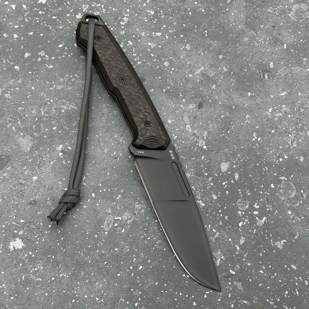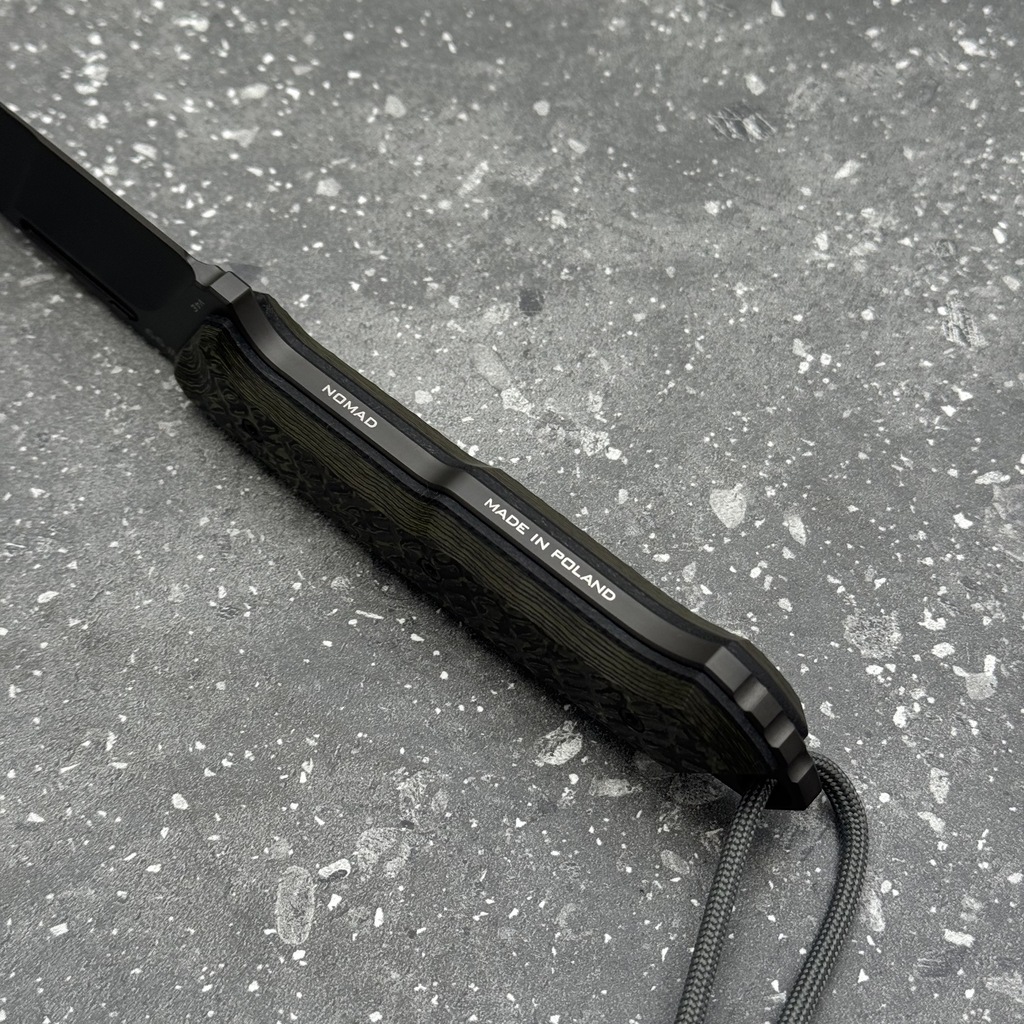The Nomad knife is produced from various types of steel (Elmax, Vanax, Vanadis 4 Extra, Vanadis 23, etc.) with different blade finish methods (PVD coatings, DLC, acid-etched, stonewash, satin). The handle is crafted from G10 composite, micarta, carbon fiber (carbon, FatCarbon) with diverse colors and unique patterns meticulously selected by the knifemaker.