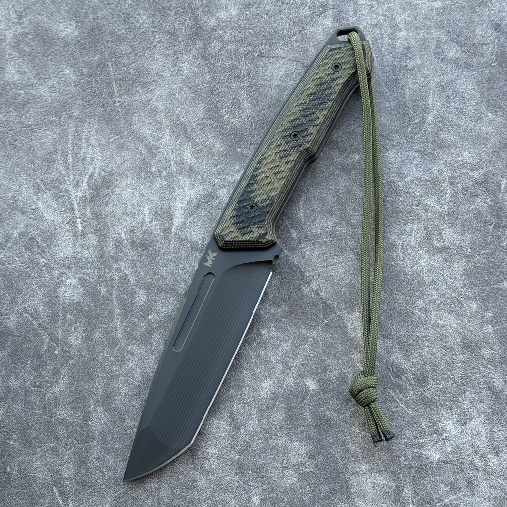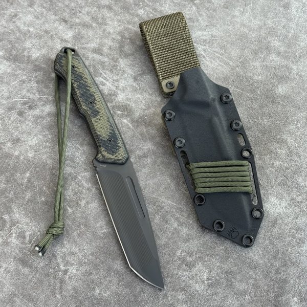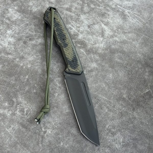 - Blade: Fixed blade (full tang), tanto style with groove grind (GG / hollow), flat grind tip, double-sided fuller, plain cutting edge