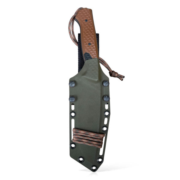At the end of the knife handle there is a hole for attaching an additional wire, which can serve as a protection against dropping the knife during operation, or an additional gripper to facilitate the removal of the knife from the holster. Originally, it includes a paracord section with a shade matching the design.