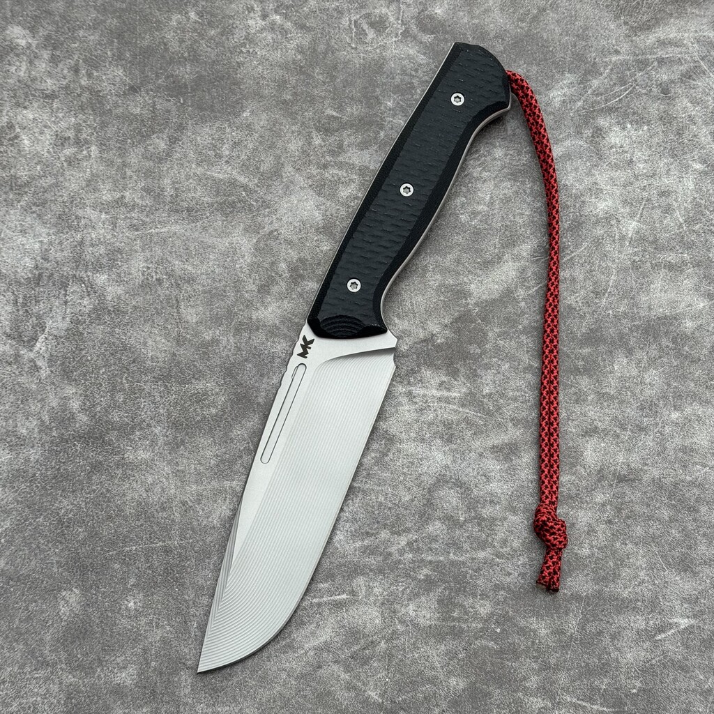 - Blade: Fixed blade (full tang), drop point style blade with groove grind (GG), flat grind tip, plain cutting edge