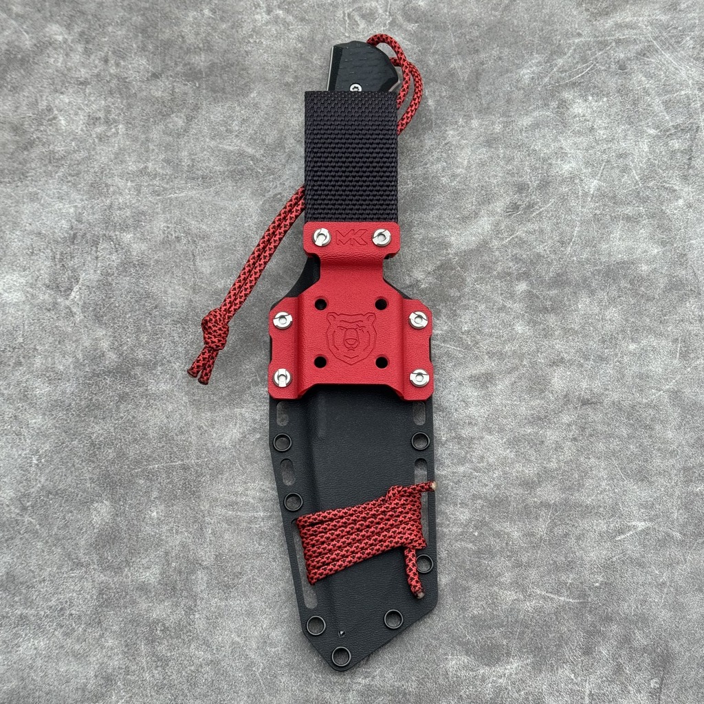 **The handle scales are made of Black Canvas Micarta with red G10 inserts. The nuances on the blade, the colors of the handle and the pictograms on the holster are characteristic of the âFear The Bearâ series. The knife comes with black Kydex holster with red additions.
