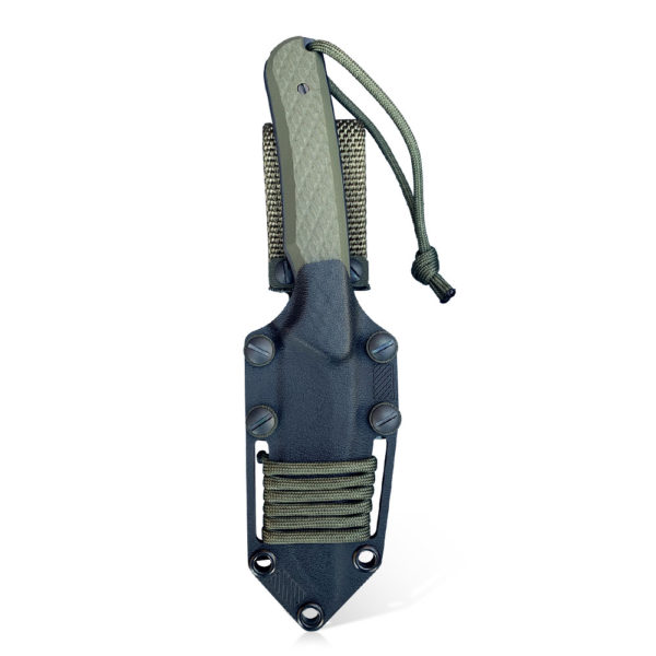 Presented MK Knives & Tools Scout”3X #3″ Knife | Vanadis 4 Extra Olive has a blade made of Vanadis 4 Extra steel with a black PVD coating anf innovative grind (grooves on the blade). The handles are made of olive G10 composite. The holster is made of black kydex material. Kydex can be mounted vertically or horizontally (along the belt, which allows for discreet carrying), thanks to a specially designed buckle compatible with MOLLE solutions.