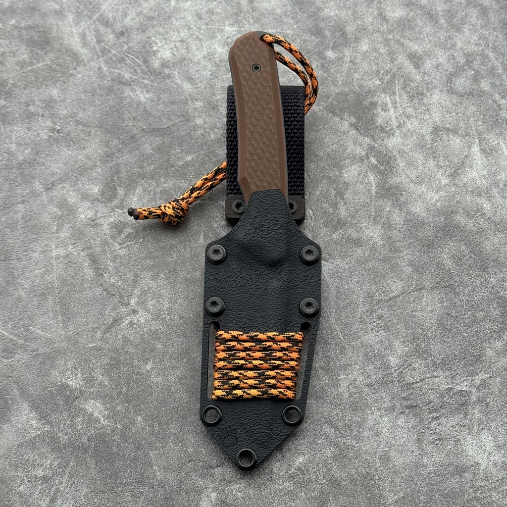 - Rękojeść: brązowa z pomarańczowymi przekładkami (brown G10 with orange liners)
