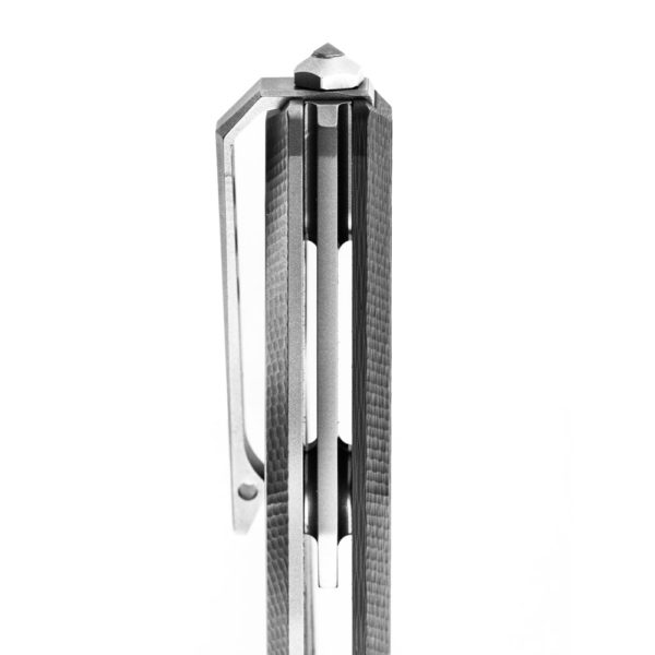 - Handle: titanium (milled) / contoured carbon fiber, titanium backspacer, double-sided carrying clip (Tip-Up)