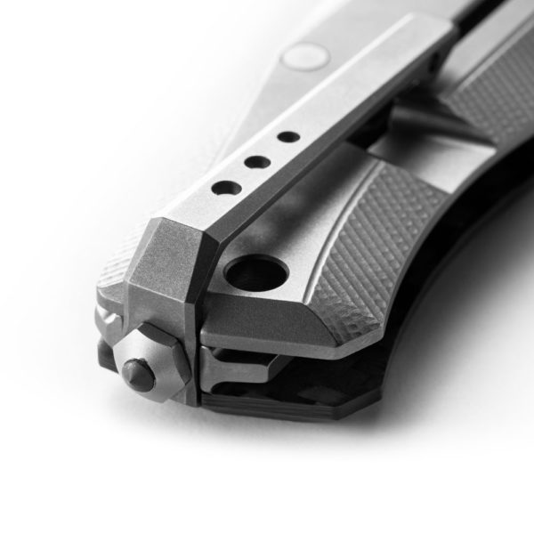 The knife is opened due to a subtly protruding from the blade, a removable flipper (fin). The knife unfolding is very easy and smooth thanks to the Double Crown system based on ball bearings. This system is an extension of the standard ball bearing and has two bearing rings for better blade stability and easier opening of the folder. The knife has a stable and durable frame lock protecting against accidental closing. A steel insert is placed in the titanium lock letter to increase the life of the locking mechanism. The insert also has a special tab to prevent the lock from being excessively pulled out of the handle (overtravel stop).