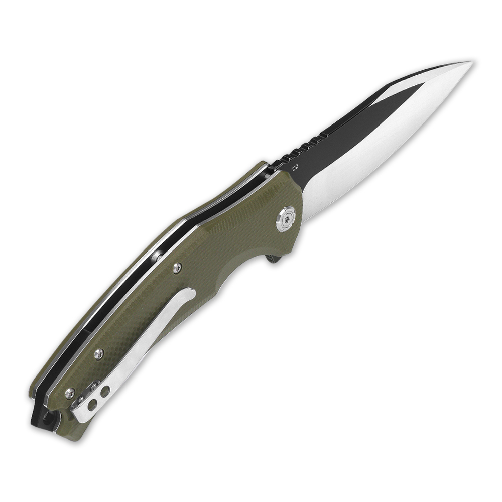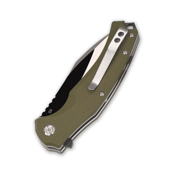 The blade derived a flat grind, has gained a very “working” clip point style blade, which makes it easier to pierce and make frequent repetitive cuts. The blade made of high-carbon D2 chrome-vanadium tool steel provides an effcient cut and is characterised by high abrasion resistance. The blade has a crimping (jimping), which supports the thumb during cuts requiring pressure. The blade has been partially coated with titanium nitride (PVD), which is a decorative element, but also increases the service life of the coated part of steel, protecting it against corrosion.