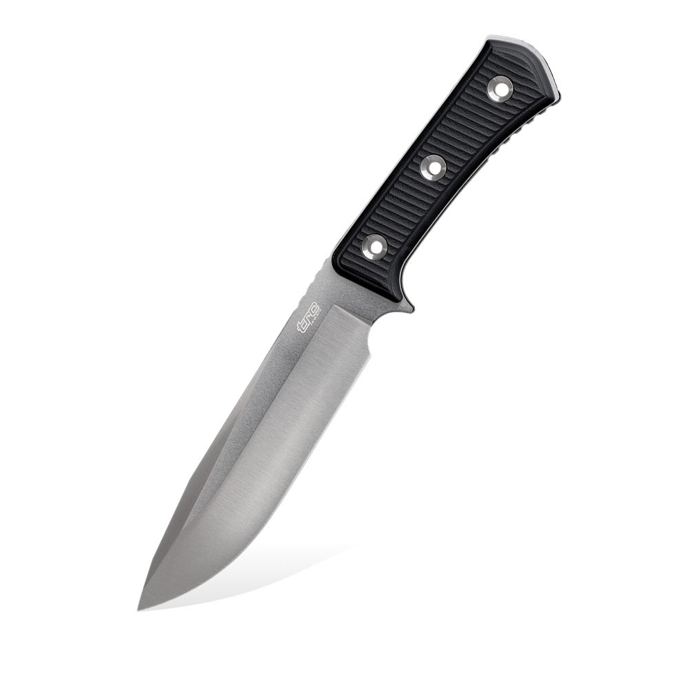The handle is fastened with through pins, allowing for the attachment of a lanyard or paracord wrap, which helps prevent dropping the knife and facilitates drawing it from the sheath.