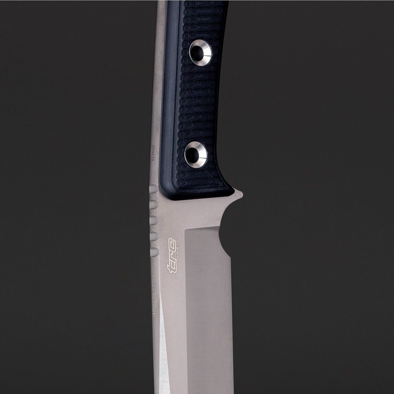 Despite its size, the knife remains well-balanced and easy to handle. Jimping on the spine supports the thumb for controlled cuts, while the guard prevents the hand from sliding forward. The rounded handle spine improves comfort and control, and the extended tang at the butt can serve as a hammer or glass breaker.