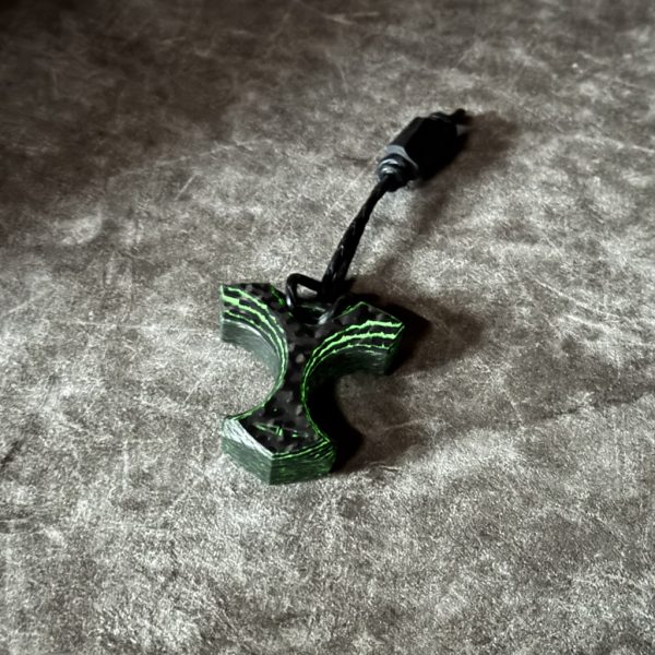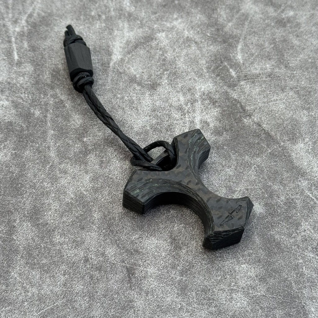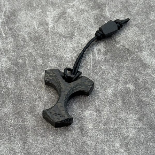 GITD – Glow In The Dark. The uploaded image is a visual of a Mjolnir made from a special type of carbon fiber that glows in the dark after being exposed to daylight or artificial light. The pendant emits an impressive greenish-black glow, enhancing its unique and striking appearance.
