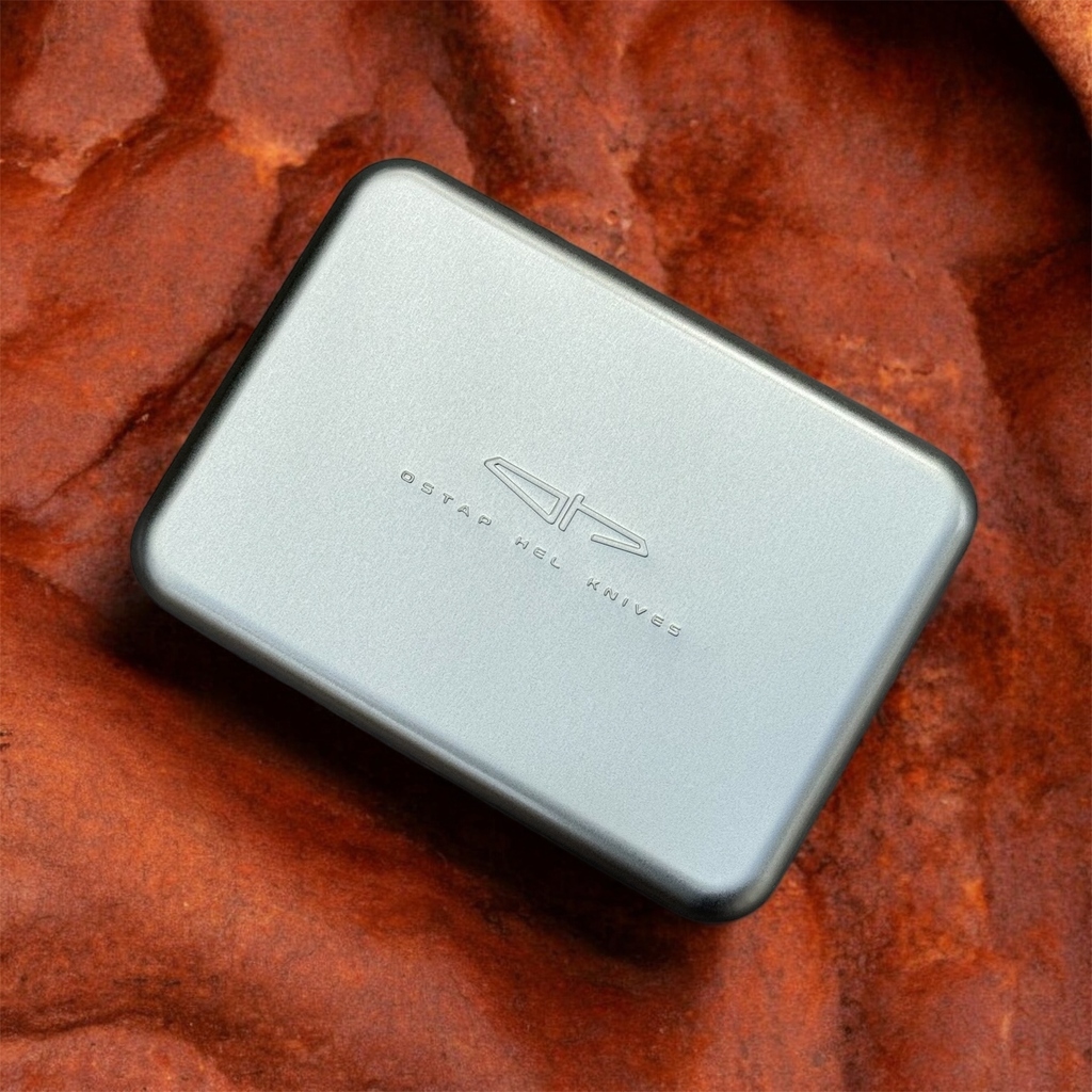 Premium aluminum display box with embossed Ostap Hel Knives logo — designed for protection and exhibition