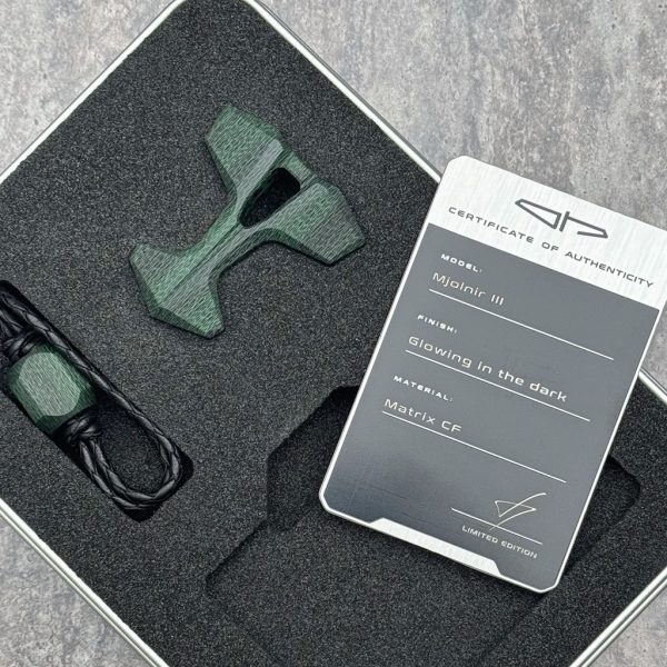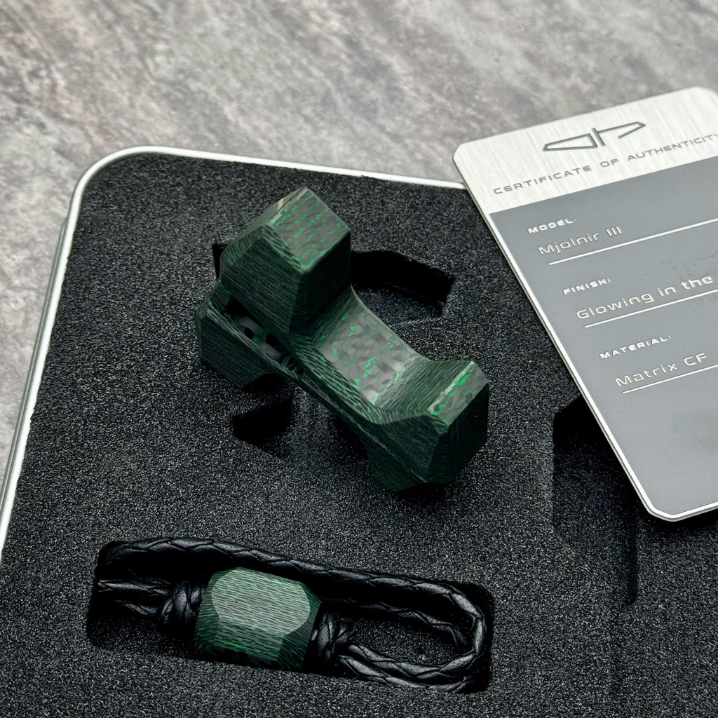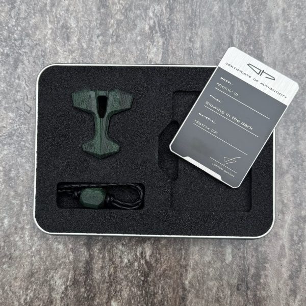 Viking Ornament, Titanium Pendant, Necklace Charm, Worry Stone, EDC Gadget, Stylish Accessory, Unconventional Jewelry, Souvenir Gadget! With many functions but uniquely Mjolnir III Matrix CF GITD Limited Edition, directly from the workshop of one of the most talented Polish designers in the world of knives and EDC tools. Ostap Hel Knives, as mentioned, is a showcase of entrepreneurship and productivity, and now you have the opportunity to admire this distinctive design!