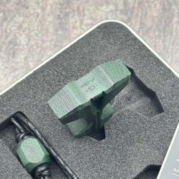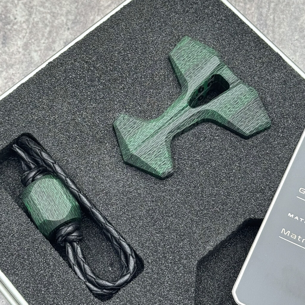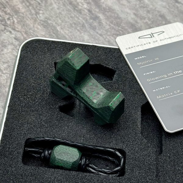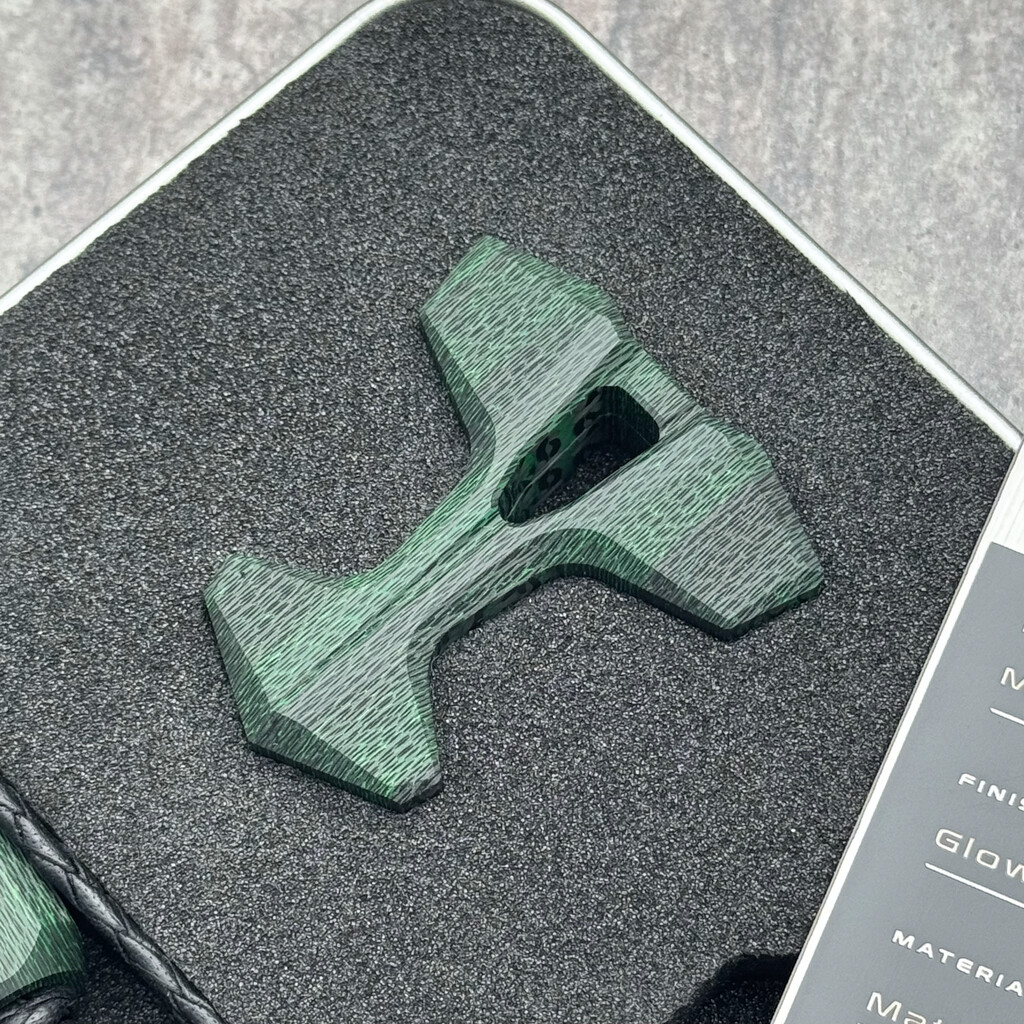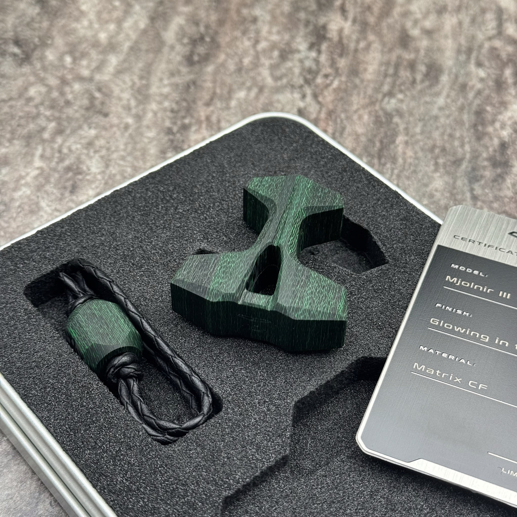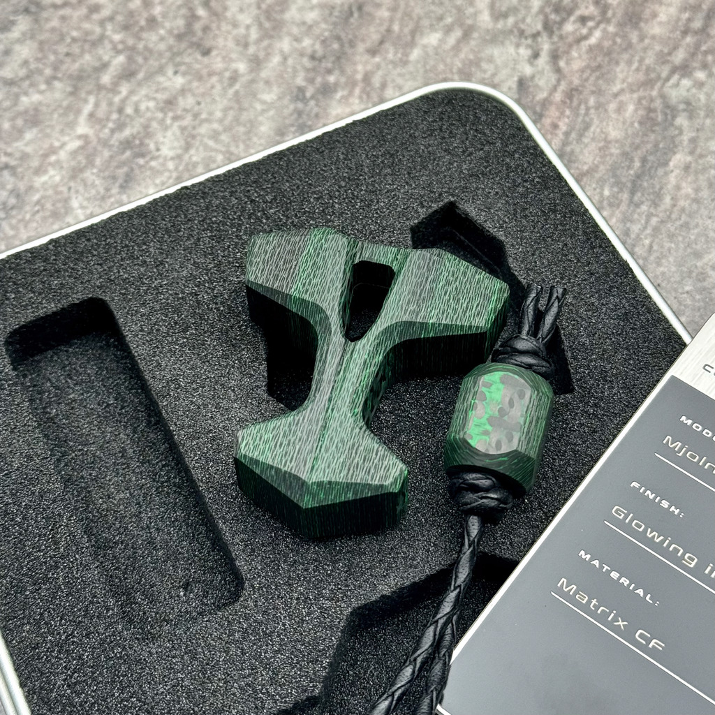 GITD – Glow In The Dark. The uploaded image is a visual of a Mjolnir made from a special type of carbon fiber that glows in the dark (GITD) after being exposed to daylight or artificial light. The pendant emits an impressive greenish-black glow, enhancing its unique and striking appearance.