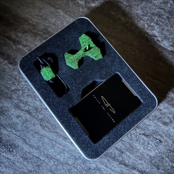 - Elegant aluminum box with the Ostap Hel Knives logo embossed on the top cover.