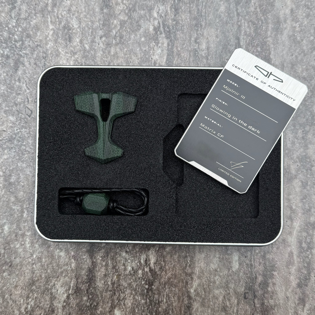 - Contents: Mjolnir III Matrix CF GITD, a certificate on a sianless steel sheet, Matrix CF GITD bead, aluminium gift box with Ostap Hel Knives logo engrave