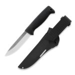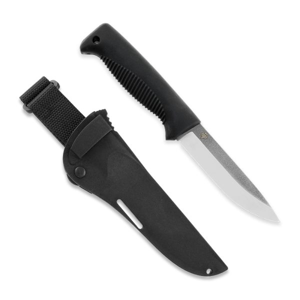 **The presented version of the knife features uncoated N690 stainless steel blade, a black handle, and a black composite sheath.