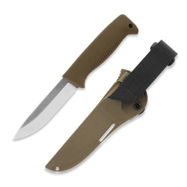 **The presented version of the knife features uncoated N690 stainless steel blade, a coyote handle, and a coyote composite sheath.
