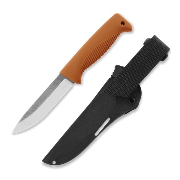 **The presented version of the knife features uncoated N690 stainless steel blade, orange handle, and black composite sheath.