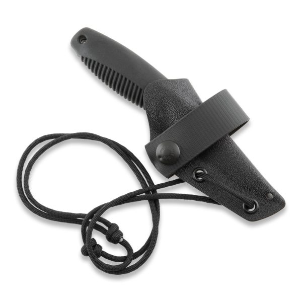 **The presented version of the knife features an uncoated blade, a black handle, and a black Kydex sheath with belt loop equipped in Pull-the-Dot snap.