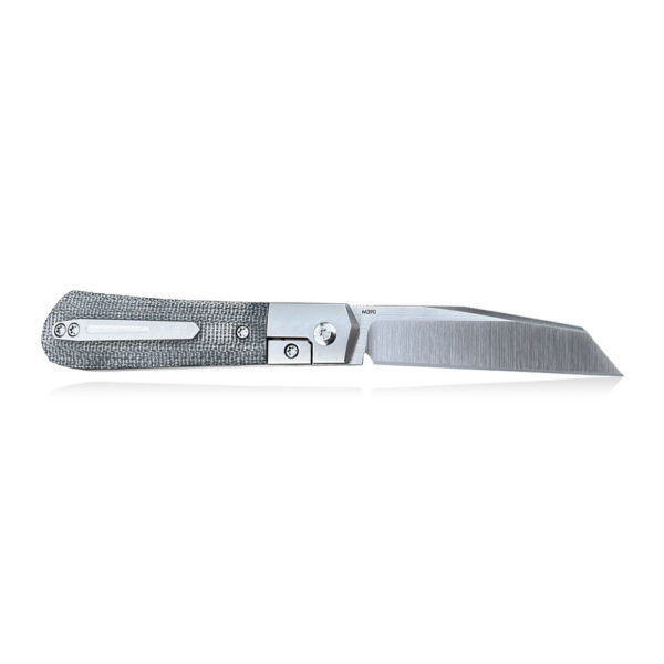The knife blade is made in the modified wharncliffe style and has a flat grind. The style in which the blade was made predisposes it for everyday use and determines its usefulness, e.g. for precise cutting of the material at the ruler, etc. The cut from the side of the spine towards the tip of the blade enables better penetration of the material being cut. On the spine of the blade, next to the bolster, we can see jimping that supports the thumb during cuts that require pressure, and is also the grip plane of the front flipper.