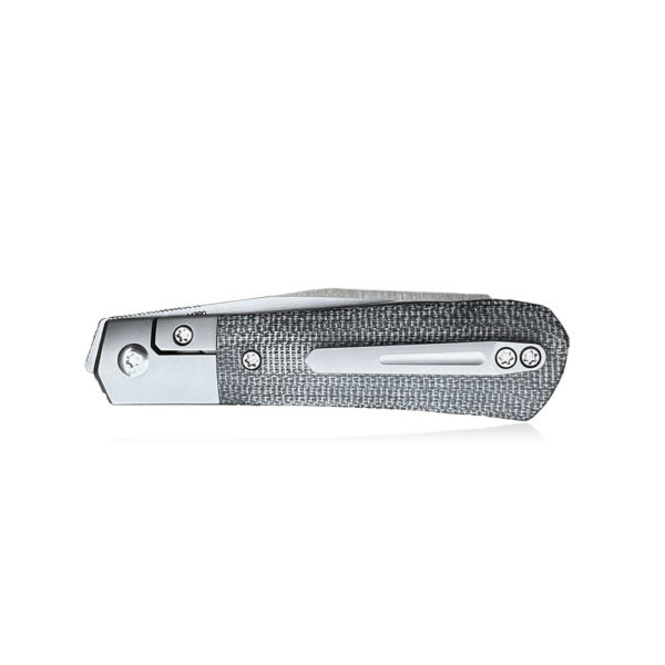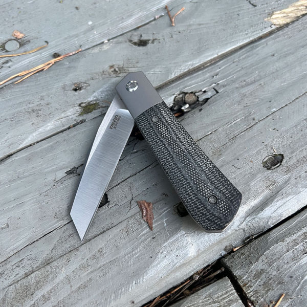 - Handle: titanium body (liners and backspacer); black micarta handla scales (Black Canvas); one-sided titanium carrying clip (Tip-Up)