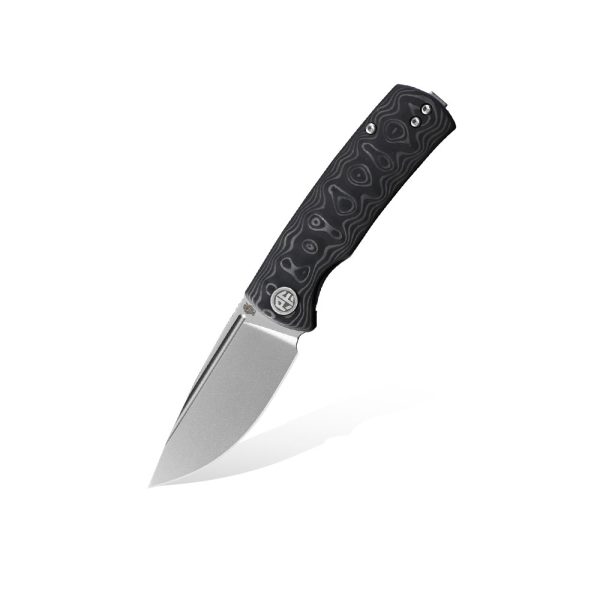Prezentowany nóż posiada wydajne ostrze typu drop point ze stali 14C28N z jasnym wykończeniem (sand blasted), okładkami rękojeści z klasycznego włókna węglowego. Designu noża dopełnia backspacer z G10 oraz tytanowy klips mocujący. Otwieranie noża następuję za sprawą wystającej górnej płetwy (front flipper) a ostrze blokuje blokada typu liner lock.