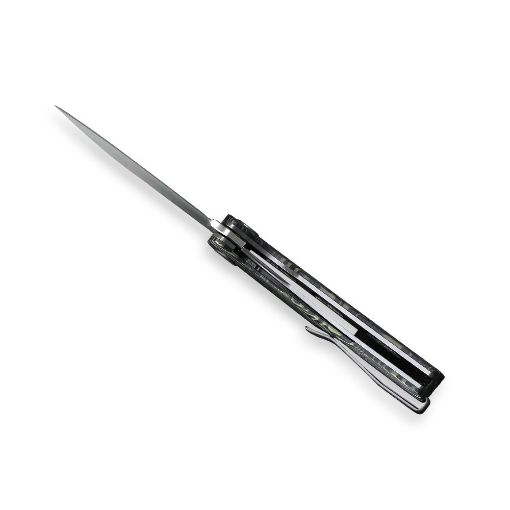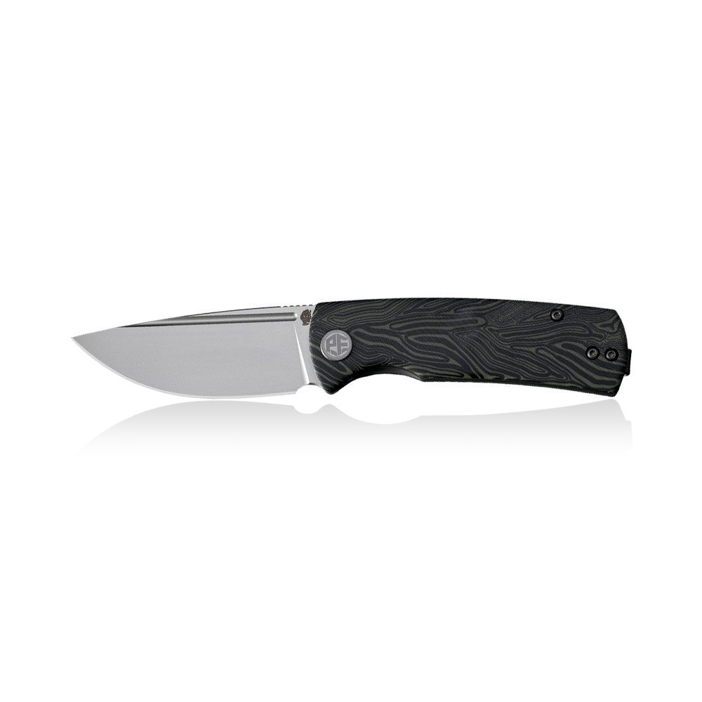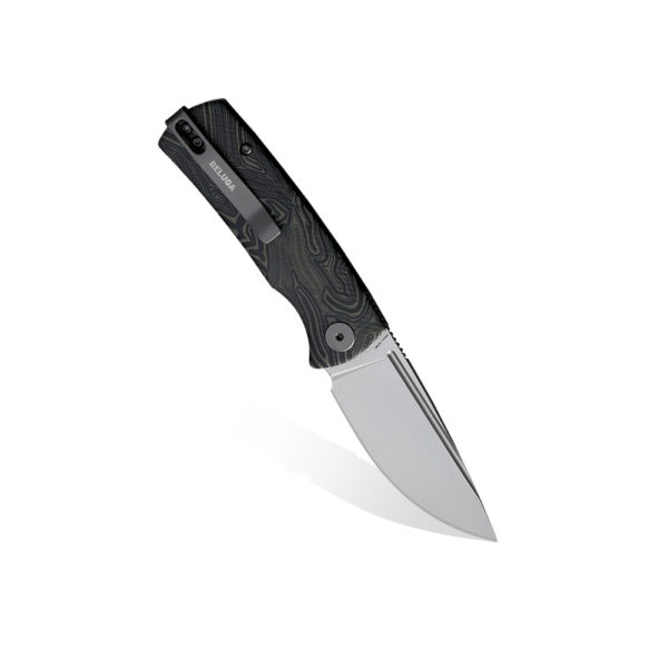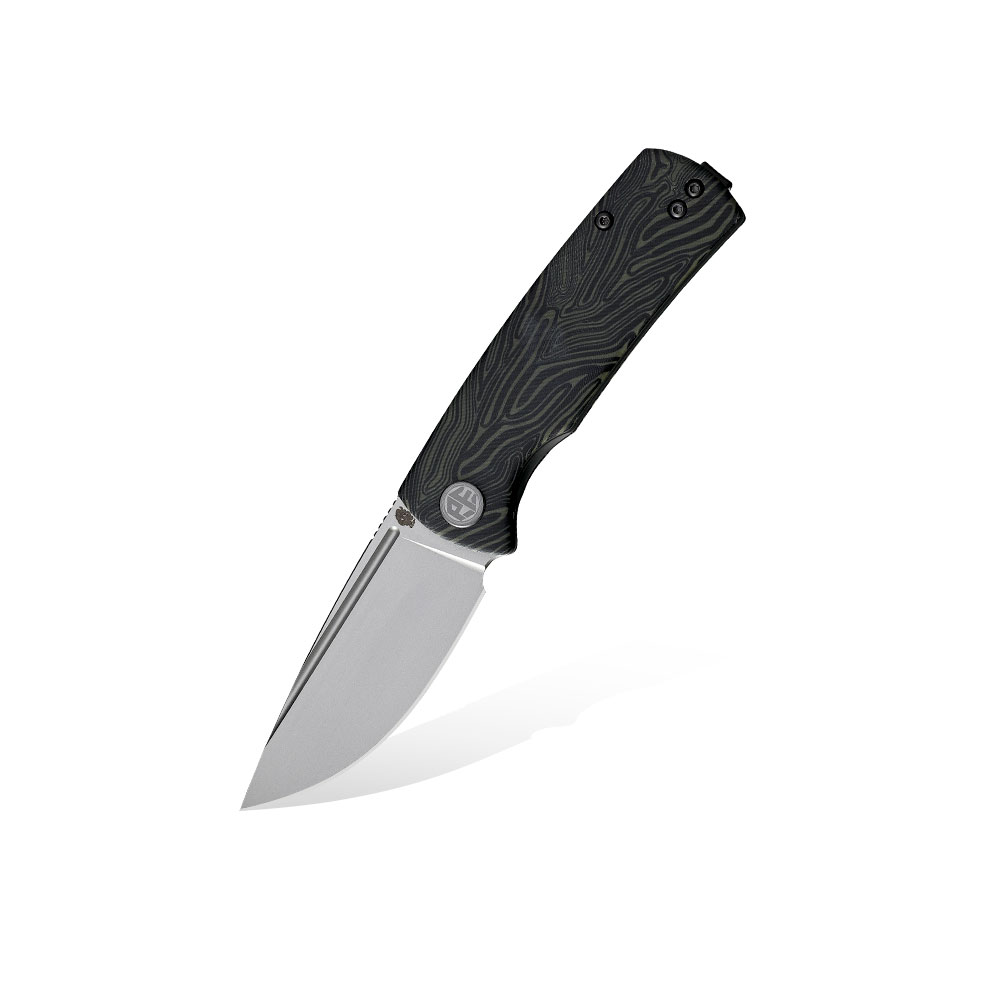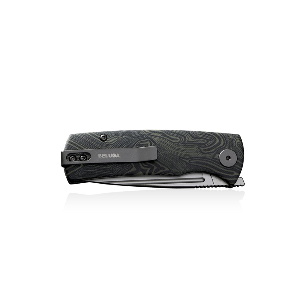 Petrified Fish Beluga PF-P01X GRDMP Green Damask Pattern Folding Knife Folder has an efficient drop point blade made of 14C28N steel. The knife handle is made of G10 composite formed in damascus pattern. The design of the knife is completed with a G10 backspacer and a titanium carrying clip. The opening of the knife occurs due to the protruding front flipper and the blade is blocked by a liner lock.