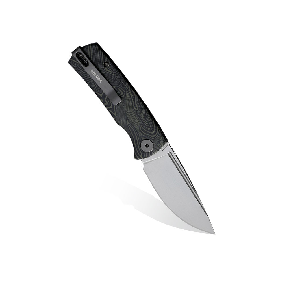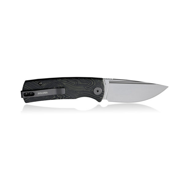 Beluga with a fairly wide blade and a groove located in the upper part of the blade (fuller) and, above all, opening in the form of an front flipper, stands out among other Petrified Fish models. A working drop point blade with a very universal application and Swedish Sandvik 14C28N steel, which is the core of the structure, enhances the utility values of the knife. Beluga is certainly an interesting tool for everyday use, but also a great support for outdoor trips.