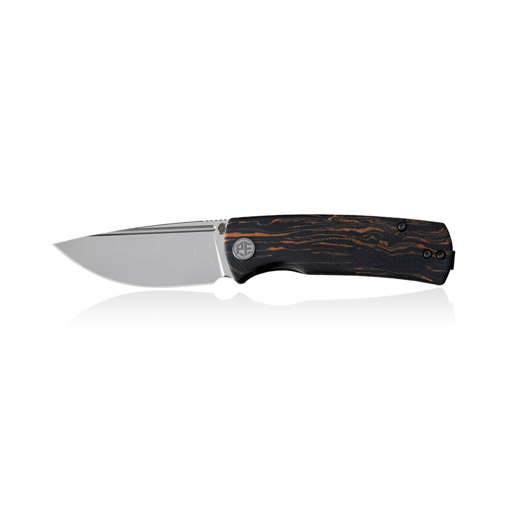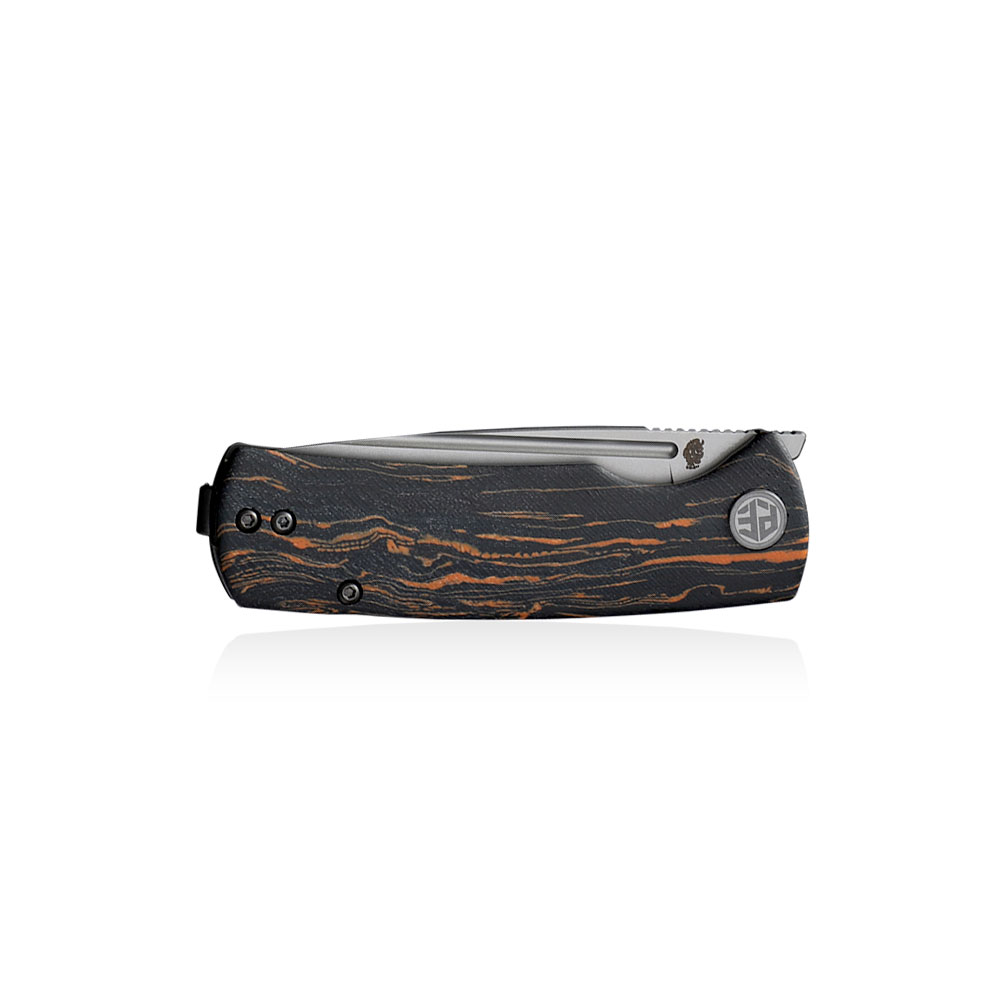 Petrified Fish Beluga PF-P01X ODMP Orange Damask Pattern Folding Knife Folder has an efficient drop point blade made of 14C28N steel. The knife handle is made of G10 composite formed in damascus pattern. The design of the knife is completed with a G10 backspacer and a titanium carrying clip. The opening of the knife occurs due to the protruding front flipper and the blade is blocked by a liner lock.