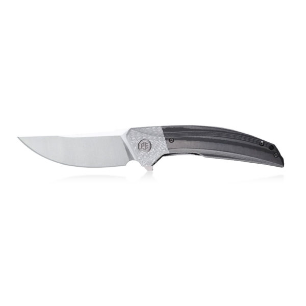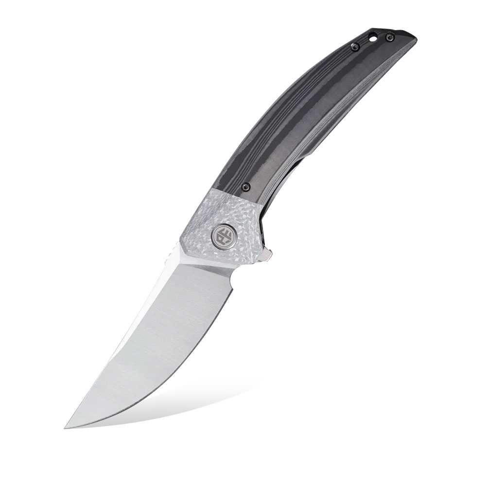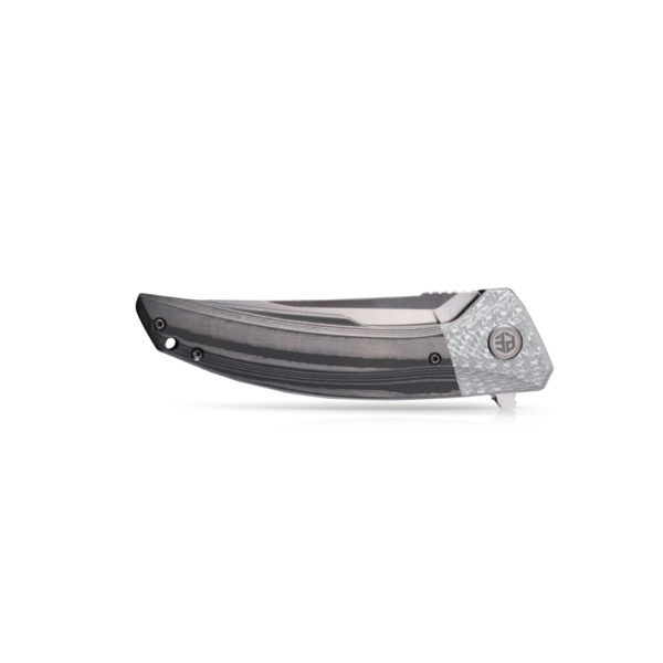 Petrified Fish Deepsea PF-P05CS folding knife has an efficient trailing point blade made of K110 steel with a satin finish known for its cutting efficiency and easy to sharpen and care for. The handle of the knife is made of two tone carbon fiber. The knife is opened due to the protruding flipper and the blade is blocked by a liner lock. The backspacer is made out of G10.