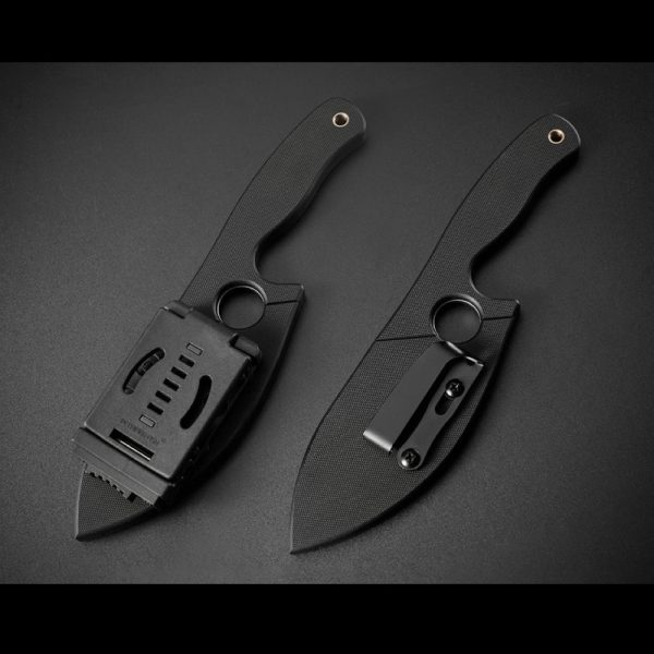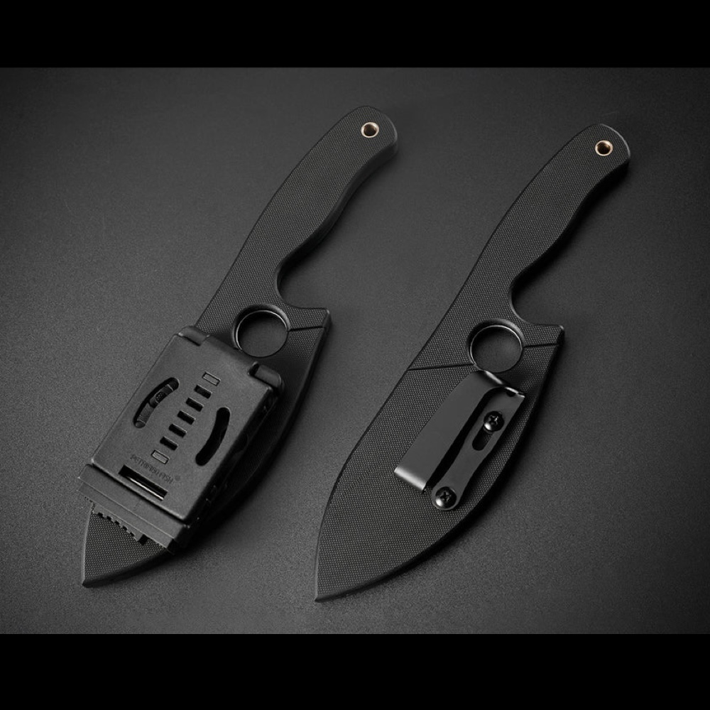 - Pochwa: czarny kompozyt G10 z dwoma akcesoriami umożliwiającymi personalizację sposobu przenoszenia: klamrą typu tek-lok oraz stalowym klipsem