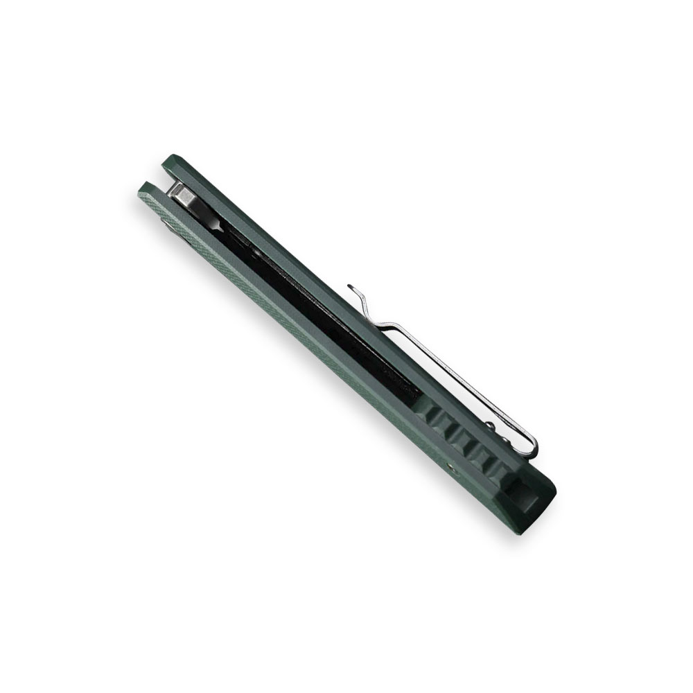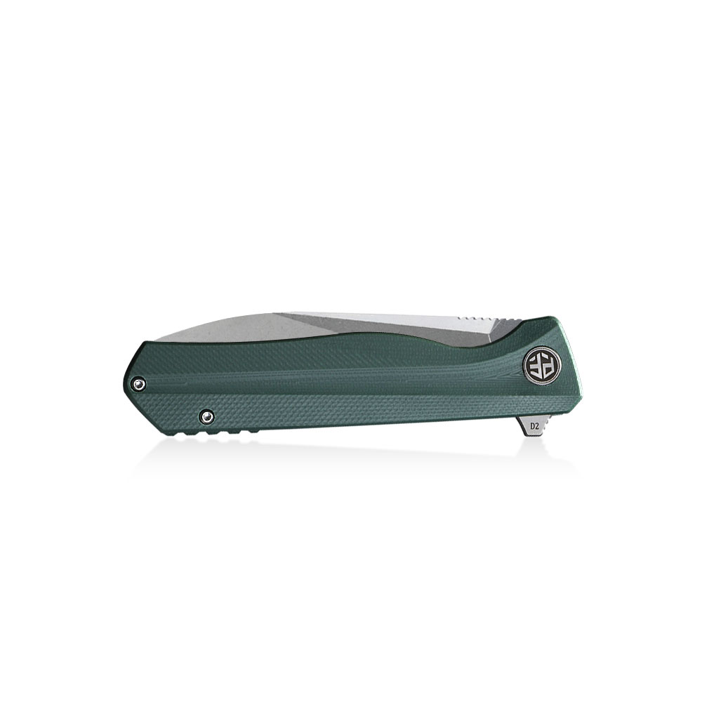 The Petrified Fish Forward PF-818 GRW Green Stonewashe folding knife has an efficient drop point blade made of D2 steel known for its cutting efficiency and easy to sharpen and care for. The handle of the knife is made of gray G10 composite. The knife is opened due to the protruding flipper and the blade is blocked by a liner lock.