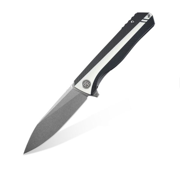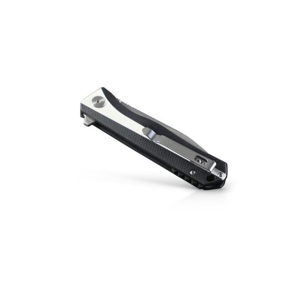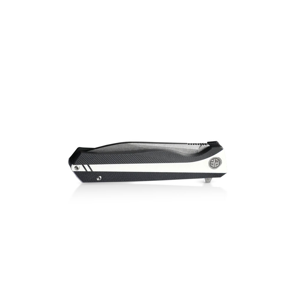 - Rękojeść: stalowa konstrukcja (linersy), okładki i backspacer – czarny kompozyt G10 połączony z białym