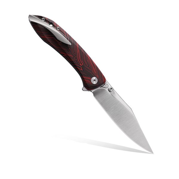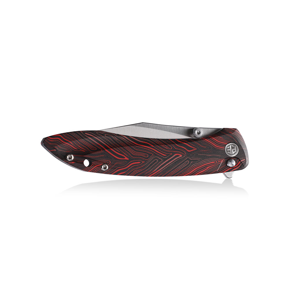 The standout features include a K110 steel blade that opens with either a thumb stud or flipper, Red Gmascus G10 handle scales, a titanium pocket clip, and a button lock mechanism.