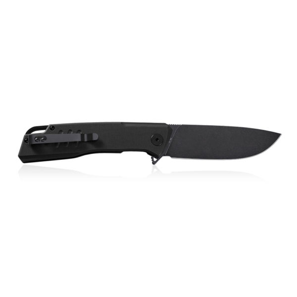 Petrified Fish Loco PF-B02 DDW Black G10 Folding Knife has a drop point blade made of D2, black stonewash finished steel with a flat grind and runs on ceramic ball bearings. The handle of the knife is made of black G10 composite mounted on steel liners. The design of the knife is complemented by a backspacer and a steel deep carry pocket clip. The knife is opened by a flipper and the blade is locked by a liner lock.