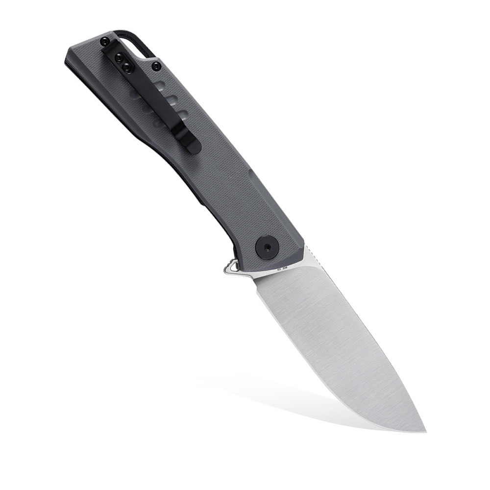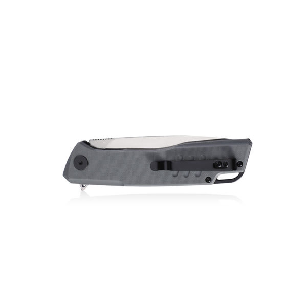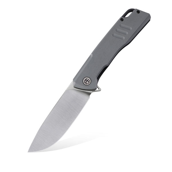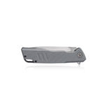 Petrified Fish Loco PF-B02 GAS Grey G10 Folding Knife has a drop point blade made of D2, satin finished steel with a flat grind and runs on ceramic ball bearings. The handle of the knife is made of grey G10 composite mounted on steel liners. The design of the knife is complemented by a backspacer and a steel deep carry pocket clip. The knife is opened by a flipper and the blade is locked by a liner lock.