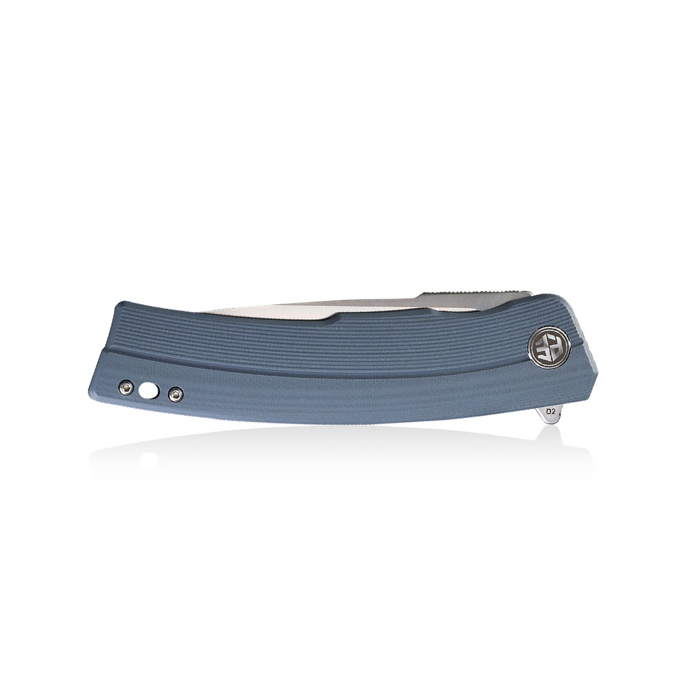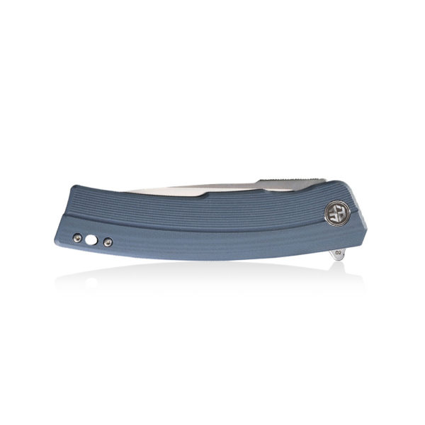Petrified Fish Magazine PF-P02 B Blue Folding Knife has an efficient drop point blade made of D2 steel, known for its cutting efficiency and easy to sharpen and maintain. The handle of the knife is made of blue G10 composite. The knife is opened due to the protruding flipper and the blade is blocked by a liner lock.