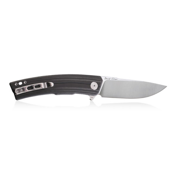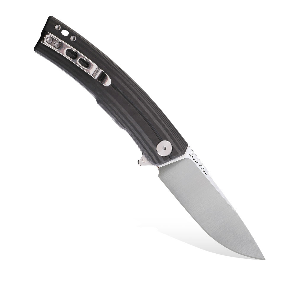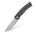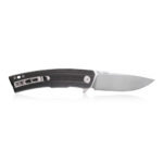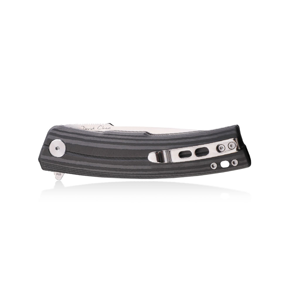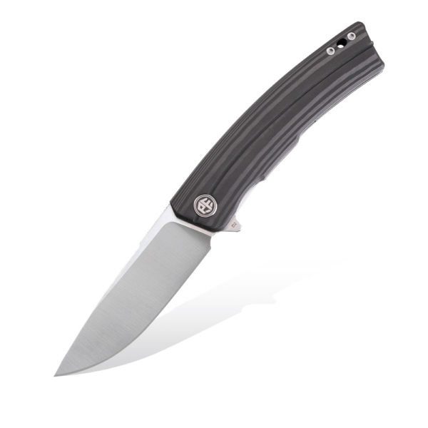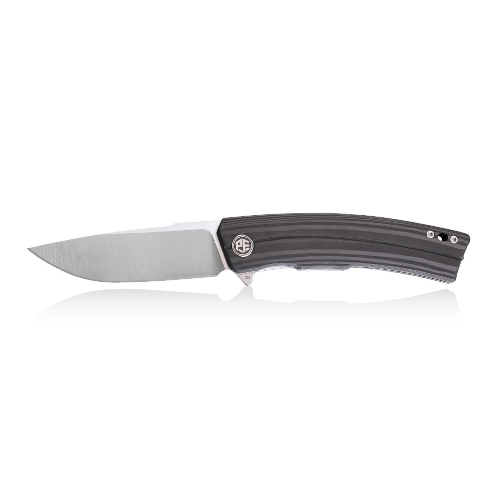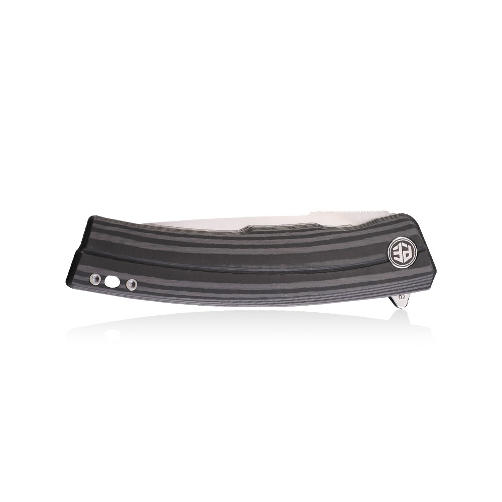 Petrified Fish Magazine PF-P02CS Folding Knife has an efficient drop point blade made of D2 steel, known for its cutting efficiency and easy to sharpen and maintain. The handle of the knife is made of G10/ Carbone Fiber composite. The knife is opened due to the protruding flipper and the blade is blocked by a liner lock.