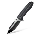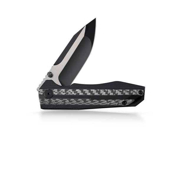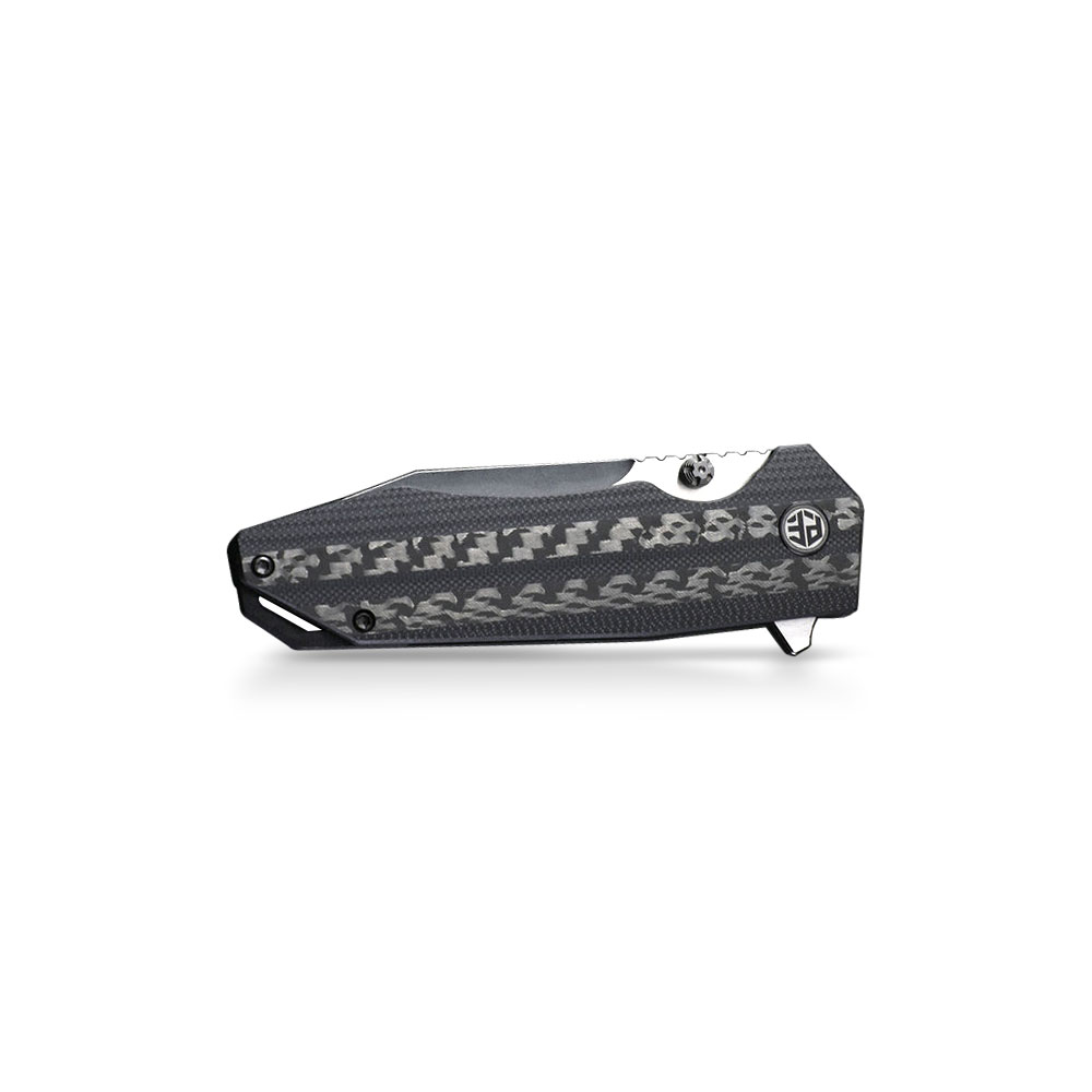 Okładziny rękojeści z połączenia włókna węglowego i wytrzymałego kompozytu G10 o antypoślizgowej i chropowatej strukturze zapewniają stabilny chwyt. Materiał okładek jest odporny na zawilgocenie, zmiany temperatury, większość rozpuszczalników i kwasów i co najważniejsze charakteryzuje się wysoką odpornością na uszkodzenia mechaniczne. Rękojeść o ergonomicznym kształcie bardzo dobrze dopasowuje się do ręki i zapewnia stabilny i mocny chwyt. Okładki zostały zamontowane na stalowych linersach i wzmocnione backspacerem z otworem na linkę.
