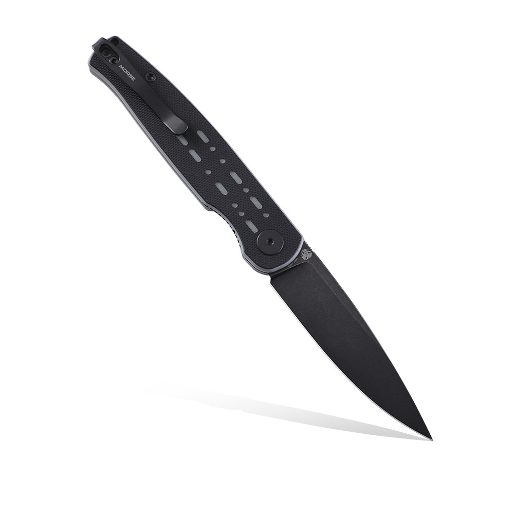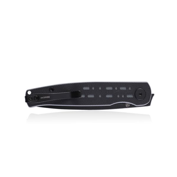 Presented Morse has a drop point blade made of 154CM, black stonewash finished steel with a flat grind and runs on ceramic ball bearings. The handle of the knife is made of multilayer G10 composite mounted on steel liners. The design of the knife is complemented by a backspacer and a steel deep carry pocket clip. The knife is opened by a front flipper and the blade is locked by a liner lock.
