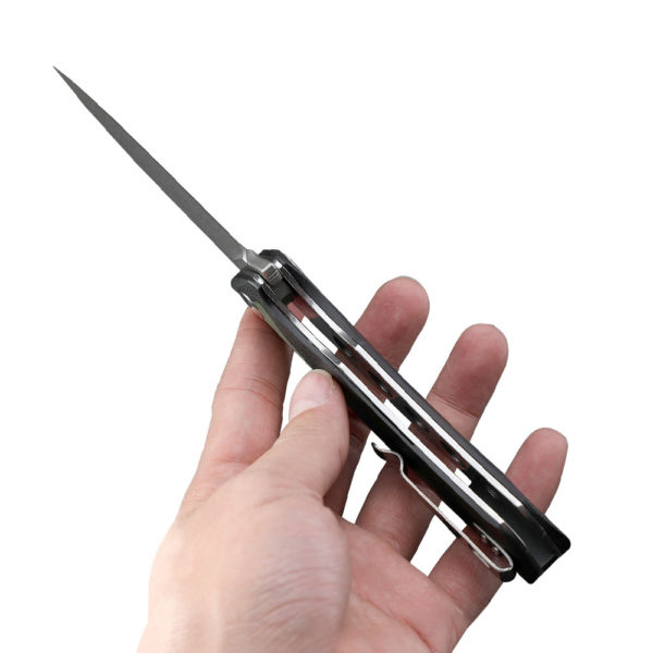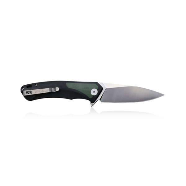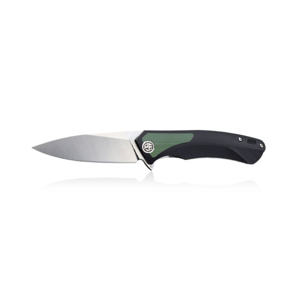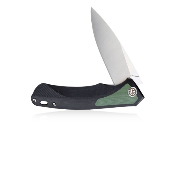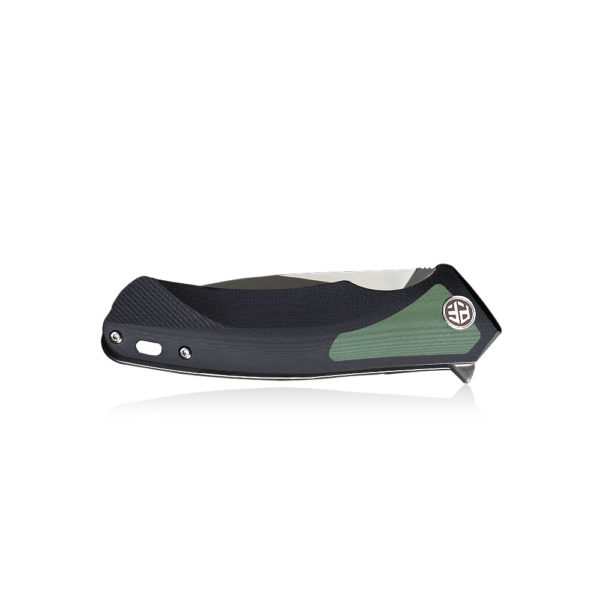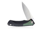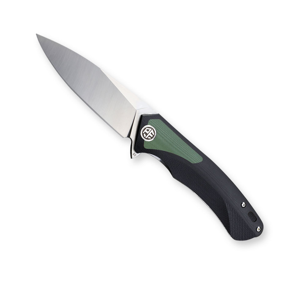 Petrified Fish Pub PF-838 Pub GRS Green-Satin folding knife has an efficient drop point blade made of D2 steel known for its cutting efficiency and easy to sharpen and maintain. The handle of the knife is made of black G10 composite with green inserts. The knife is opened due to the protruding flipper and the blade is blocked by a liner lock.