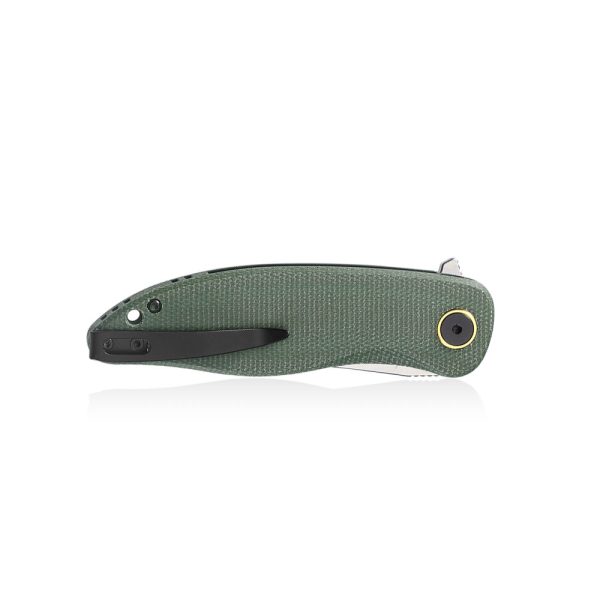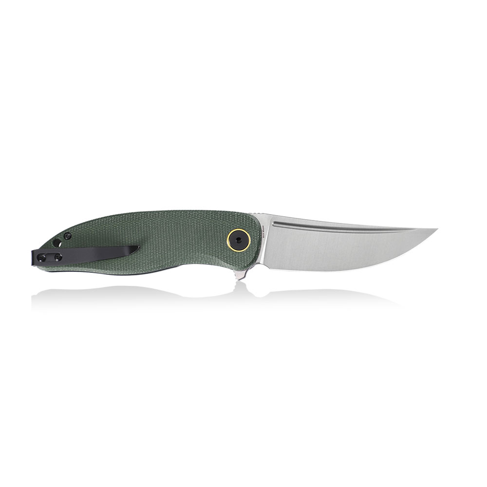 Petrified Fish Simum PF-P06 GRMS Green Micarta Folding Knife has a clip point blade made of K110 steel. The handle of the knife is made of green canvas micarta mounted on steel liners. The design of the knife is complemented by a backspacer and a steel deepcarry pocket clip. The knife is opened by a flipper and the blade is locked by a liner lock.
