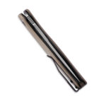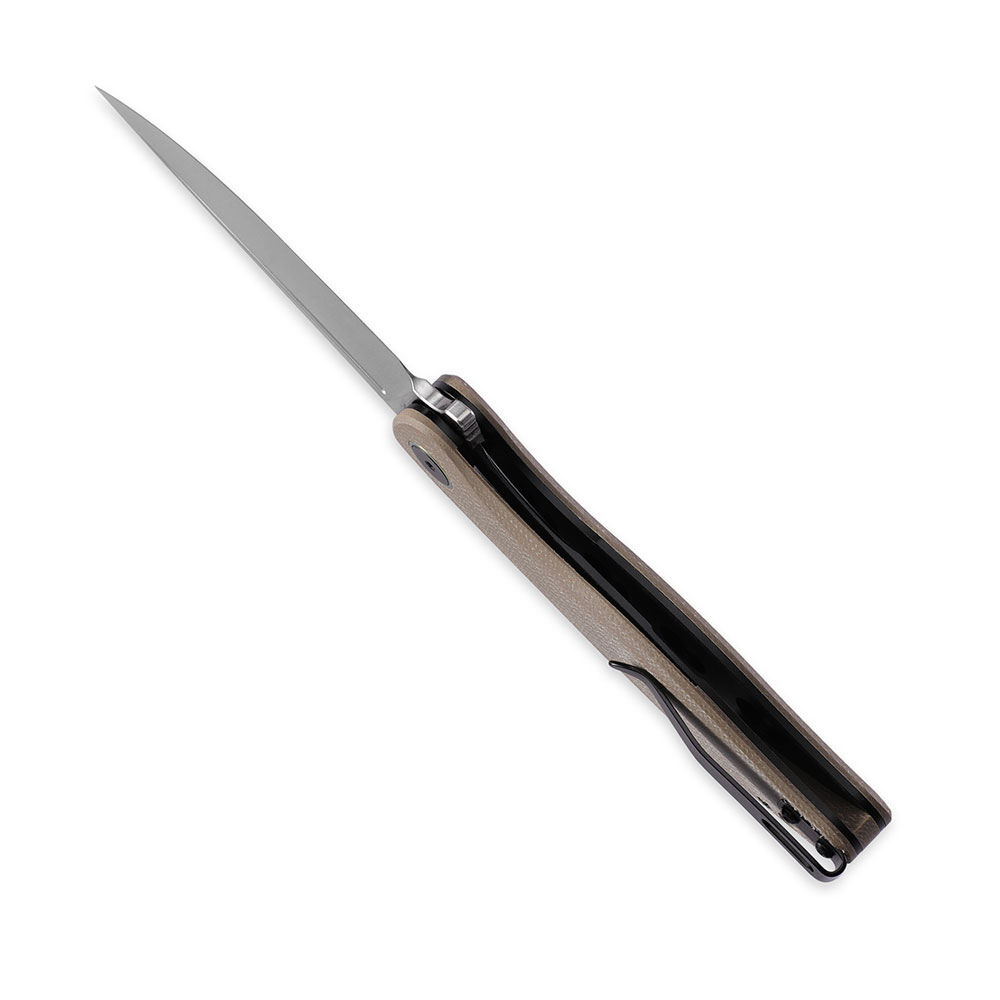 Petrified Fish Simum PF-P06 KAMS Khaki Micarta Folding Knife has a clip point blade made of K110 steel. The handle of the knife is made of khaki canvas micarta mounted on steel liners. The design of the knife is complemented by a backspacer and a steel deepcarry pocket clip. The knife is opened by a flipper and the blade is locked by a liner lock.
