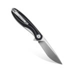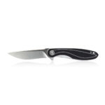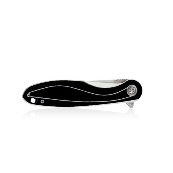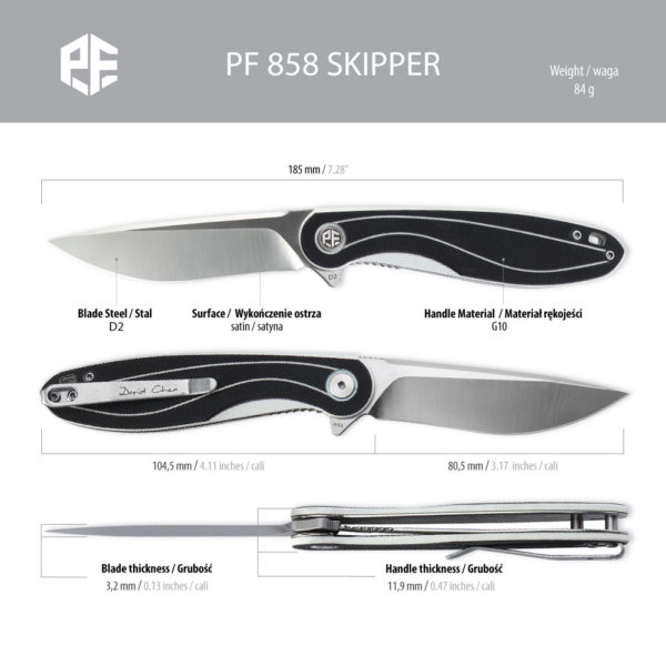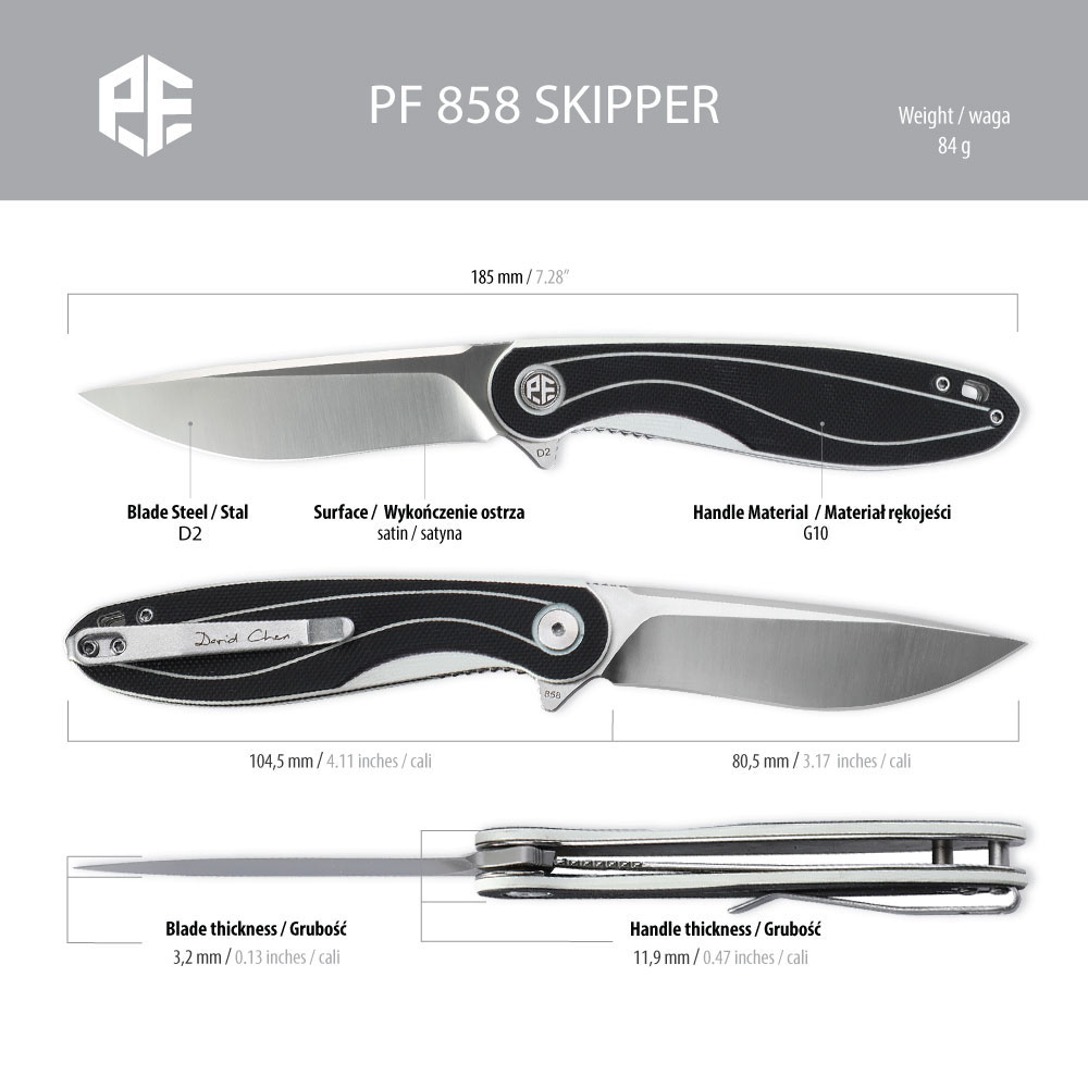 Presented Petrified Fish Skipper PF-858 W White folding knife has an efficient drop point blade made of D2 steel known for its cutting efficiency and easy to sharpen and care for. The handle of the knife is made of black G10 composite (black and white colours). The knife is opened due to the protruding flipper and the blade is blocked by a liner lock.
